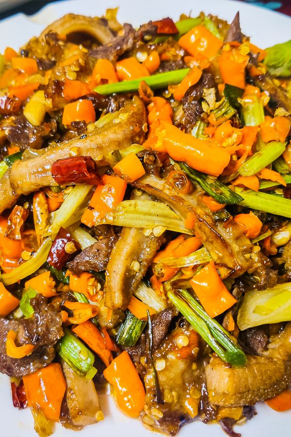 名字颇具气势的南雄名菜:梅岭鹅王。外地人乍一看“鹅王”,很容易误会为鹅有什么特别之处,实际上鹅肉是普普通通的本地产土鹅,能担起一个“王”字只因为它是广东辣菜无冕之王。将鹅肉切块,配上厚薄适中的酸笋片和大量香料翻炒焖煮,光是辣椒就有三种之多,其中最不起眼的干椒“霸王辣”是霸道辣味的来源。