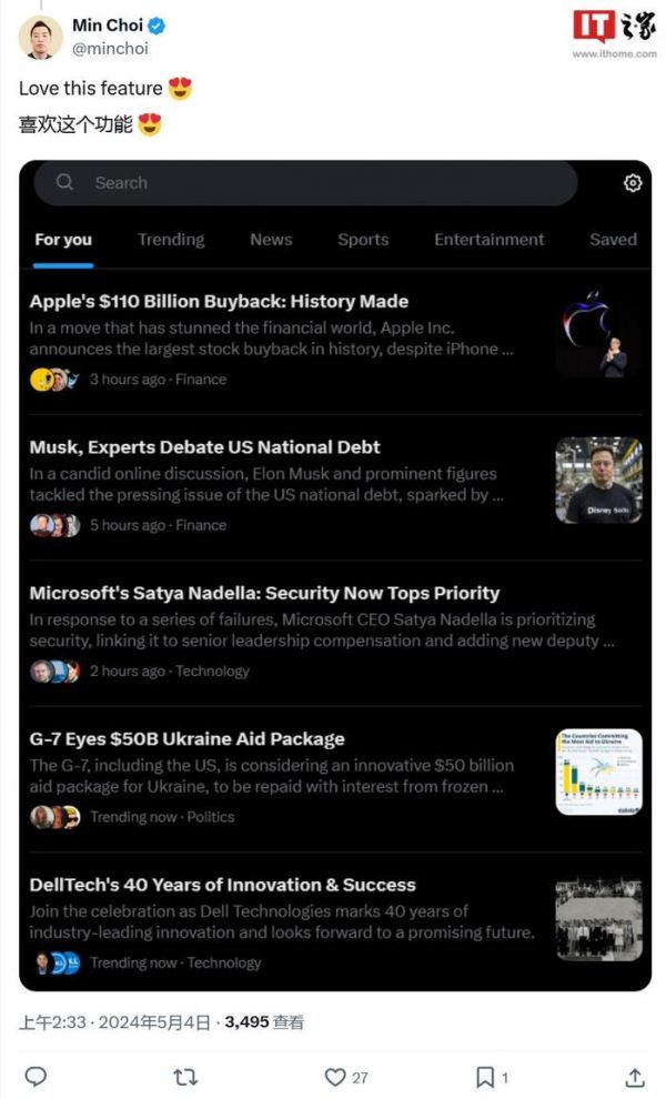 IT 之家注:X 在更名前曾有个名为 Moments 的类似功能,主要是由人工策划,但在 2022 年被砍掉。