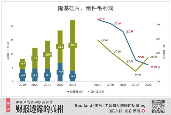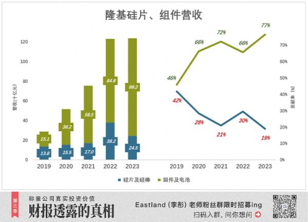 2023年,组件及电池收入992亿,占营收的77%;硅片及硅棒收入245亿,占营收的19%;
