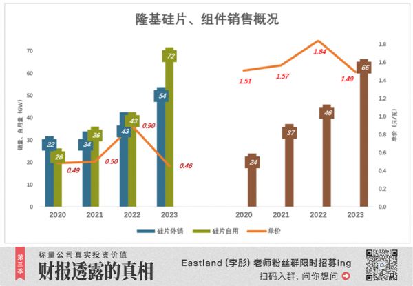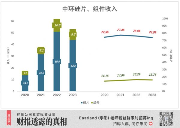 2023年,硅片销售收入回落至438亿,占营收的74%;组件销售收入93亿,占营收的15.7%。
