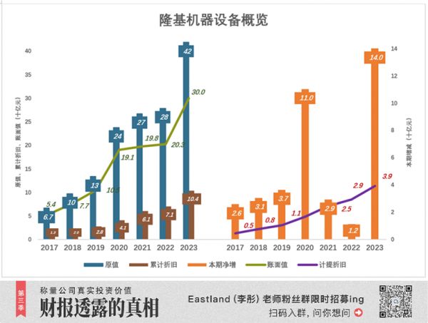2020年、2023年,机器设备原值出现两次大的飞跃,净增金额分别为110亿、140亿;