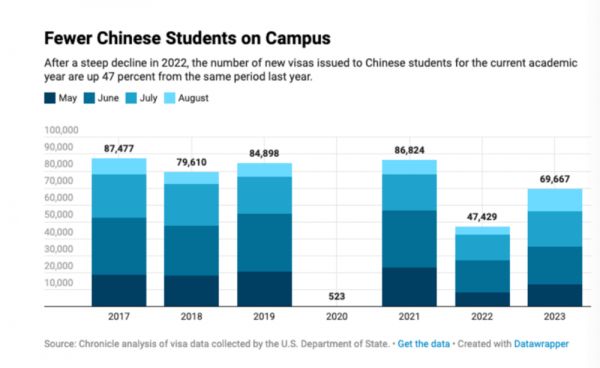 图:上图为近年中国学生5~8月获发美国学生签证数量,下图为同期印度学生获发美国学生签证数量。丨来源:高等教育纪事报