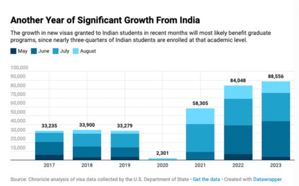 涌向美国的脚步没有放缓。据美国《高等教育纪事报》(The Chronicle of Higher Education)报道,根据美国国土安全部数据,截至2023年9月,持有美国学生签证的活跃人数,印度为32万人,中国为25.4万人。印度15年来首次取代中国,成为美国留学生最大来源国。