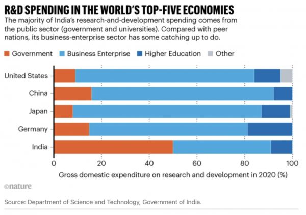 图:前五大经济体,研发投入占GPD比例,据2020年数据丨图源:Nature