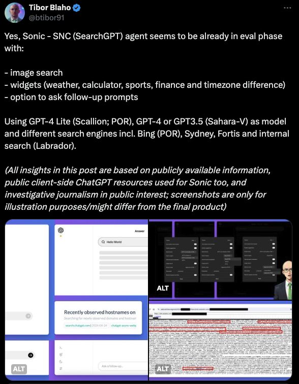 OpenAI 要做 AI 搜索挑战谷歌这件事已经传了很久,传说中的 SearchGPT 似乎真的要来了。据软件开发者 Tibor Blaho 爆料,OpenAI 的 AI 搜索产品 Sonic - SNC(SearchGPT)已进入评估阶段,新增多项功能: