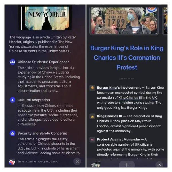 Arc Search的捏一捏总结(左)、为我浏览功能(右)