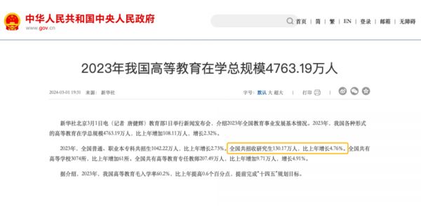 即便到2023年,全国共招收的研究生人数也只有130.17万人。