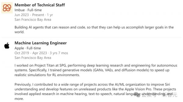 终于,大概在一年前他选择离开苹果,加入了AI初创公司Imbue。在那里,他也能够参与野心勃勃的项目,只是节奏可以更平和。