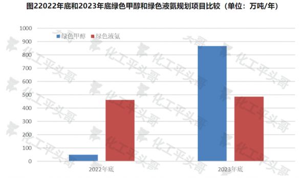 图:2023年绿色甲醇规划项目突然猛增,超过绿色液氨。来源:化工平头哥
