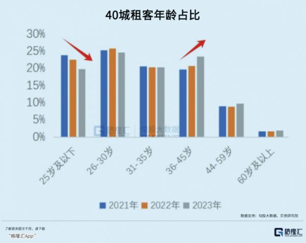 贝壳研究院近日发布了一个惊人的数据:2023年,全国重点40城租赁成交中,35岁以上的租客占比超过35%,比2021年提升4.9%。