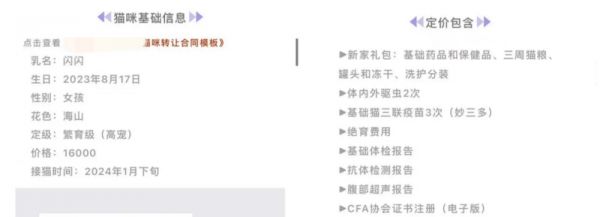 另一位猫咪爱好者Caroline也遇到了类似的情况。“因为实在想养一只美短,在小红书上联系了一家猫舍,报价属于市场正常价格,最后成交价偏低,打了6折。但是到了猫舍之后,现场给我的感觉不是常规的宠物店,有点像集散中心交易市场。但整体环境还算干净,当天也有很多人来看宠物,最后爱猫心切还是花近2000元抱了小猫回家。”