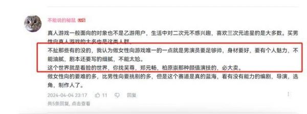 有一则评论很有代表性:真人化不是不行,但至少颜值得是吴彦祖(年轻版)那个级别的吧,谁要和普男谈恋爱?
