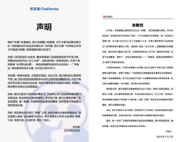 以奶茶为例,其中茶百道、蜜雪冰城均涉及其中,并发布致歉声明,承认管理失误,并采取退款、赔偿、闭店整改、开除涉事员工等措施试图挽回品牌声誉。