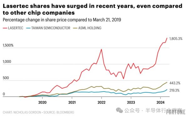 同样因半导体设备火热的还有总部位于日本横滨的 Lasertec ,该公司成立于 1960 年,当时名为东京 ITV 实验室。公司最初为医疗应用设计和开发 X 射线电视摄像机,70 年代中期扩展到为半导体行业提供检测系统。80 年代中期,公司更名为 Lasertec。