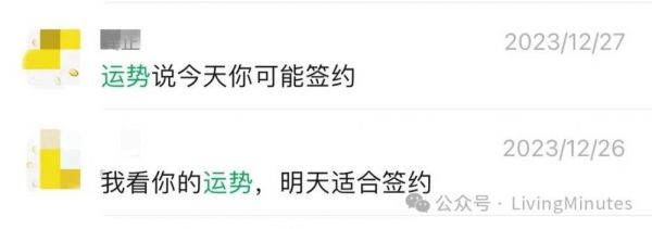 和其他年轻人、中年人一样,我也偶尔诉诸玄学。在聊天记录里搜了下“运势”,发现我老公去年12月底给我发过两条:运势说,你今天可能签约。你的运势,明天适合签约。