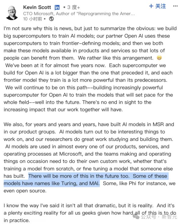 就在今天,微软首席技术官Kevin Scott证实,MAI大模型确实正在开发中。