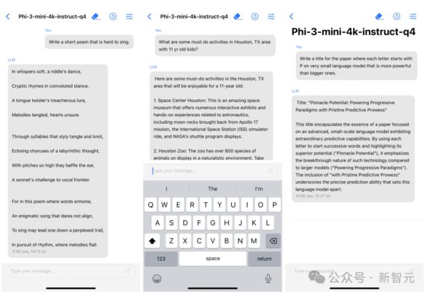 Phi-3 mini在量化到4bit的情况下,仅占用大约1.8GB的内存,用iPhone 14每秒可生成12个token。
