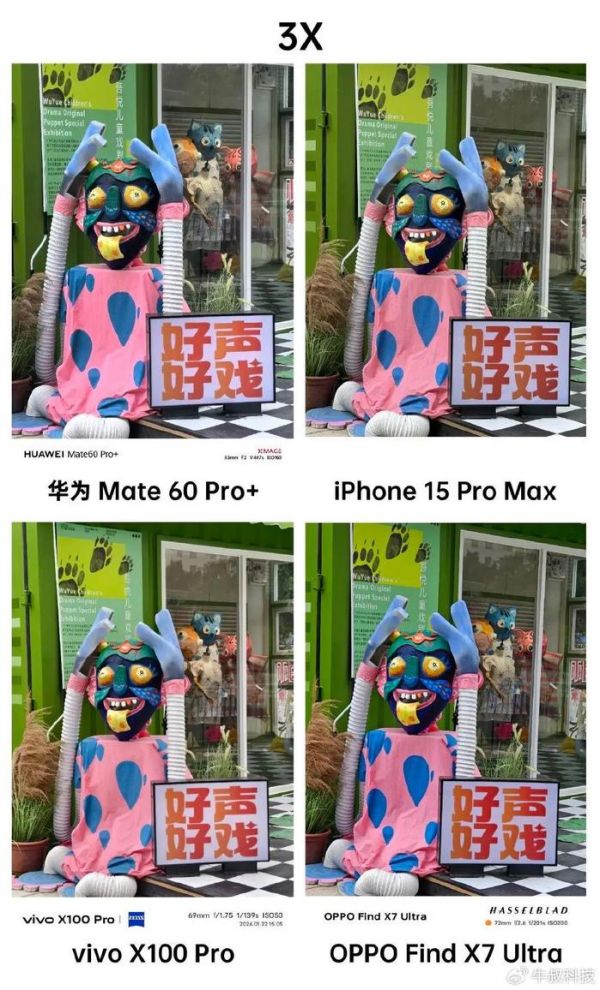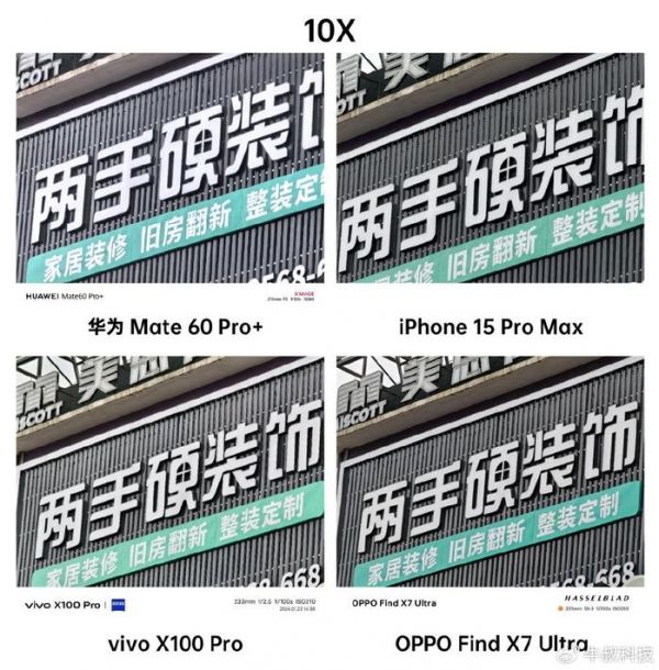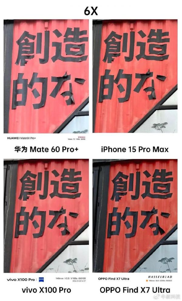 来到6X,在这个焦段下各家成像就有区别了。首先来看清晰度,华为Mate 60 Pro+的解析力很不错,可见XMAGE算法确实很有说法,能将二线硬件发挥出一线成像水准;iPhone 15 Pro Max的白平衡得要夸夸,色彩相当精准,就是字体边缘有锐化的痕迹;vivo X100 Pro跟OPPO Find X7 Ultra的清晰度更高,并且OPPO的画面还有光影立体感,显得更有质感。