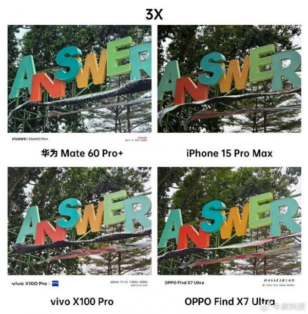 在分析它们的成像样张前,还是很有必要说一下四款机型的影像硬件差异。iPhone 15 Pro Max的长焦镜头为1200万像素,F2.8光圈,支持5倍光学变焦;华为Mate60 Pro+则是4800万像素潜望长焦镜头,F3.0光圈,支持3.5倍光学变焦;vivo X100 Pro为蔡司APO超级长焦,5000万像素,F2.5光圈,支持4.3倍光学变焦;而OPPO Find X7 Ultra则比较特别了,行业首创双潜望长焦镜头,一颗支持3倍光学变焦(F2.6光圈),另一颗支持6X变焦(F4.3光圈)。