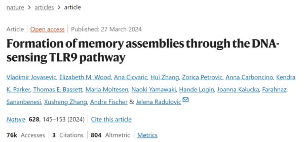 ▷Vladimir Jovasevic, Vladimir, et al. "Formation of memory assemblies through the DNA-sensing TLR9 pathway." Nature 628.8006 (2024): 145-153.