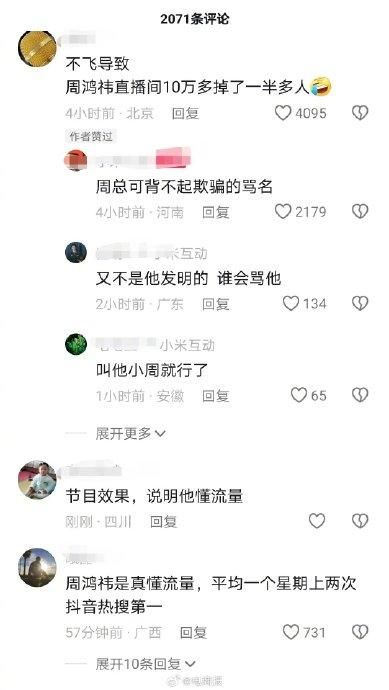 #周鸿祎直播发飙# 因错过飞行表演,周鸿祎直播发飙,直接摔帽子走人,10万多人掉一半。网友:周鸿祎懂流量密码的。
