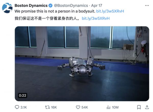 波士顿动力也在推特上阴阳怪气了一句:“我们保证这不是一个穿着紧身衣的人。”
