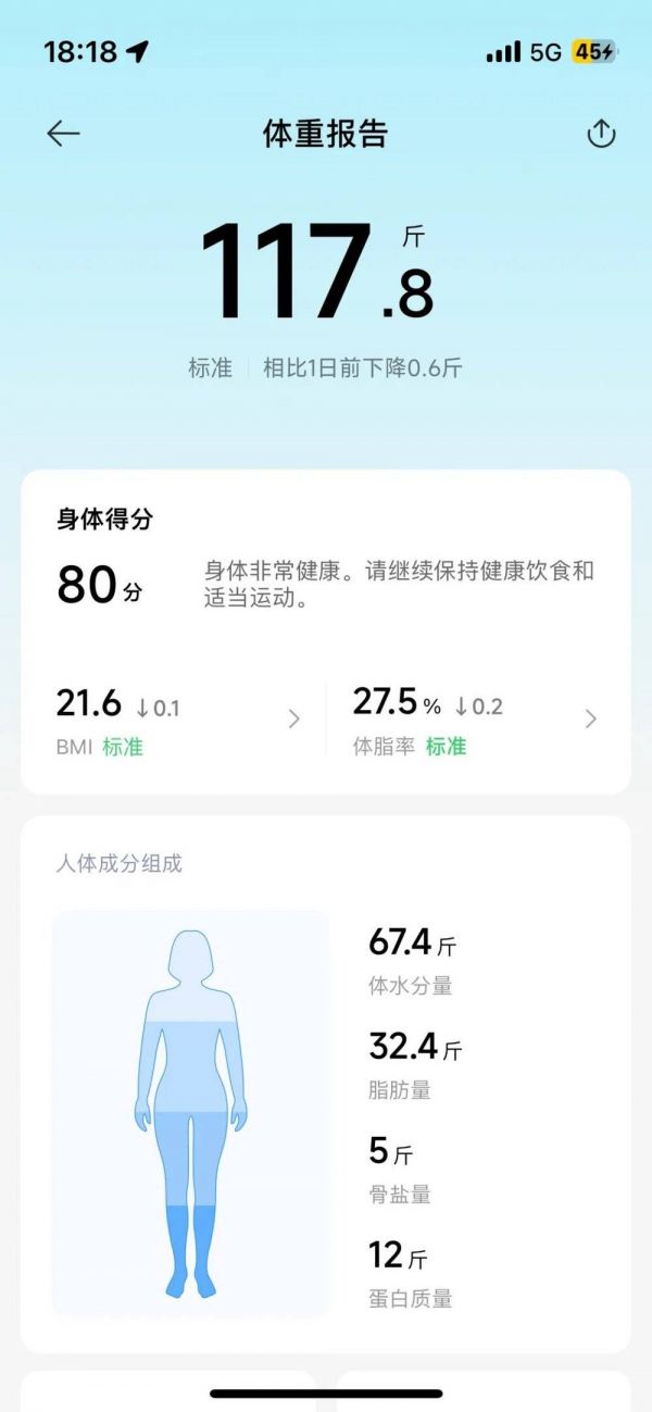 四个多月过去,芝芝成功减重40斤,体脂率从43%降到27.5%,BMI也从肥胖型变成健康型。运动带给她的不止是体型的变化,还有能量的提升,“我的情绪变得积极了很多,每次锻炼完从健身房出来,被风一吹,觉得心情好轻松”。