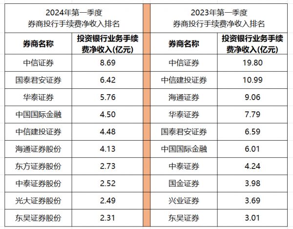 从具体收入排名来看,一季度投行手续费净收入排名前十的券商相关收入均未跨过十亿元门槛,去年同期中信证券、中信建投的投行手续费及佣金净收入分别为19.80亿元、10.99亿元,分别下滑56.11%和59.25%。