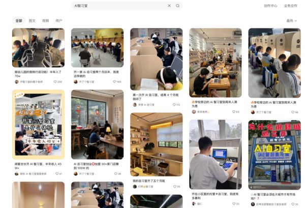 社交平台上,AI 智习室是一门大生意。随便以“AI 智习室”为关键词搜索,你能找到不少“赚麻了”“下一个风口”为标题的帖子,大致内容几乎都是雷同的,诸如“闺蜜合伙开 AI 智习室,半年收入 45W+”,又或者“和朋友合伙办智习室,3 年买了五辆车你敢信”。