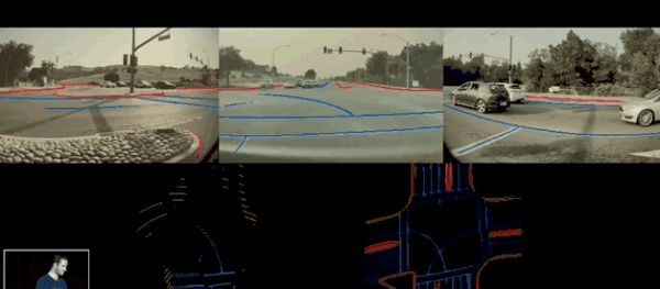 负责感知的视觉模块先工作,处理摄像头等传感器捕捉的路况数据,识别出路上有什么东西,大概怎么分布,哪些是动的,哪些是不动的,哪些是车道线,可以行车的区域有哪些等等。