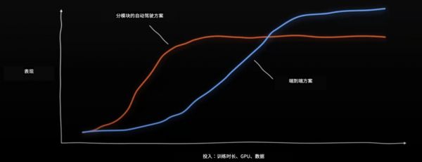端到端需要更多投入才能达到传统方案效果。图片来自小鹏原自动驾驶 AI 负责人刘兰个川在去年 CVPR 上的分享。