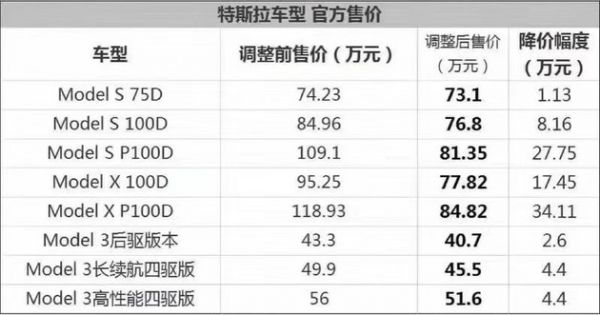 根据上海店销售人员出示的最新官方售价,Model 3降价区间为2.6万元至4.4万元、Model S降价区间为1.13万元至27.75万元、Model X降价区间为17.43万元至34.11万元,特斯拉8款车型的最新售价区间位于40.7万元至84.82万元之间。这是特斯拉系列产品进入中国市场以来降价规模和幅度最大的一次。