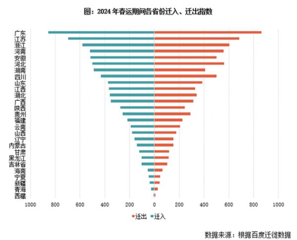 其中,广东的流入人口主要来自西南、长江中游省份以及河南。广东省历来是春运迁入迁出大户,2024年春运客流量领跑各省市。据广东省交通运输厅,春运期间(1月26日至3月5日),广东省累计发送旅客约1.28亿人次,居全国首位。