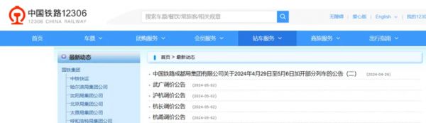 5月2日,铁路12306官网发布四则调价公告,对京广高铁武广段、沪昆高铁沪杭段、沪昆高铁杭长段、杭深铁路杭甬段上运行的时速300公里及以上动车组列车公布票价进行优化调整,将从2024年6月15日起实施。