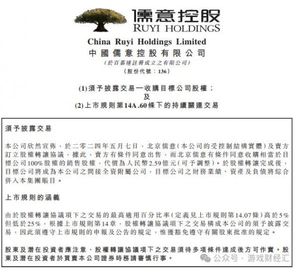 5月7日,中国儒意发布公告,公司与两家卖方(朝夕光年和北京游逸)达成协议,拟以2.59亿元收购北京有爱互娱科技有限公司100% 股权。股权转让完成后,有爱互娱将成为中国儒意的间接全资附属公司。