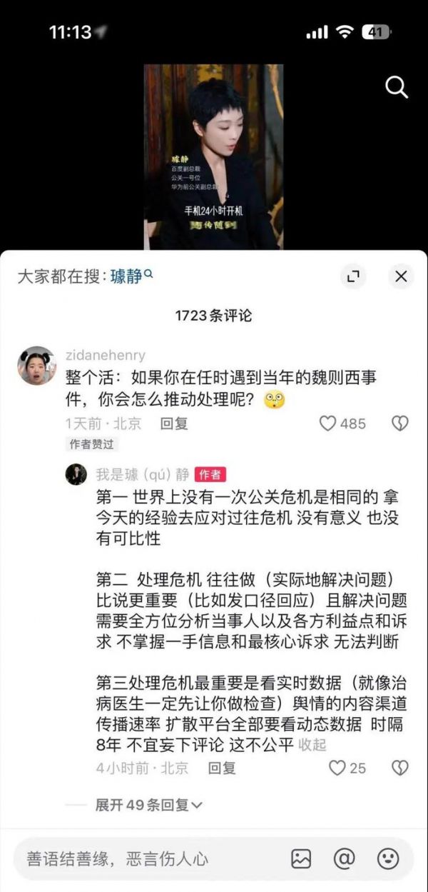 我们不得不提的是,璩静此举打破了大厂公关老大通常只在幕后操作的常规。传统上,像百度这样的大型企业的公关负责人往往在背后默默地推动公司的公关策略,而不会直接站在前台。但璩静的行为显然打破了这一惯例。她不仅亲自出马,还在抖音等平台上发布视频,与广大网友直接互动,这种做法在业界尚属首次。