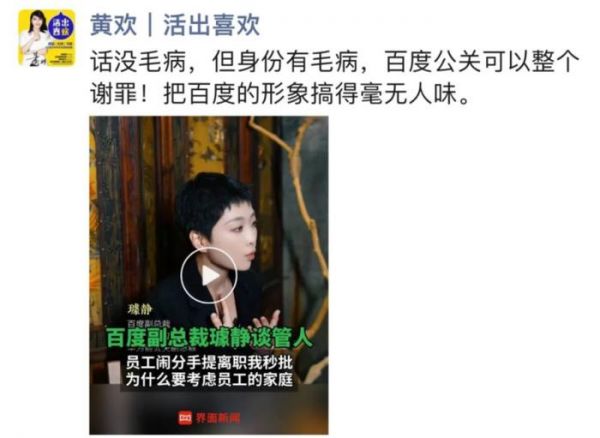 那么,璩静为何要亲自下场呢?笔者认为,随着互联网的发展,大厂老板们纷纷亲自出马,通过直播、社交媒体等方式与用户产生互动,这已经成为一种趋势。对于百度来说,李彦宏的人设更适合在正式的商业场合中出现,而不太适合在更随意、更民间的舆论场上发声。因此,璩静作为公关一号位,代表公司出面,成为了一个合情合理的选择。