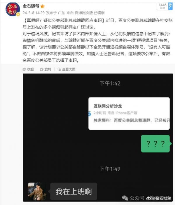 百度工作人员回应网传公关副总裁被开除:系统内仍可查询,还在职