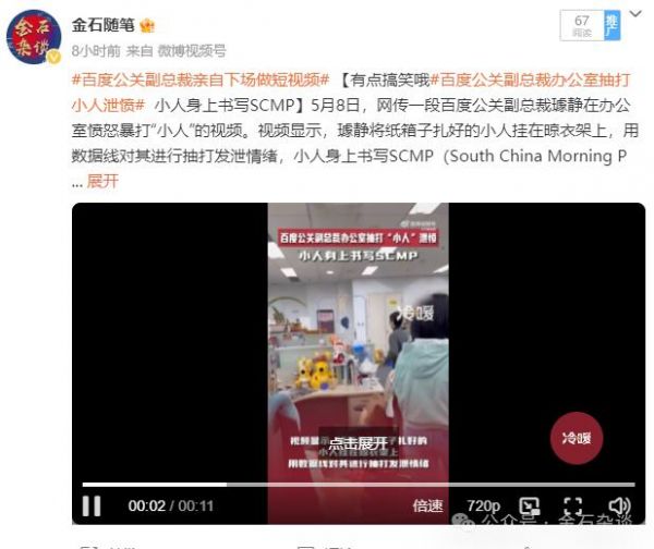 随着事情发酵,其殴打小人的视频也被爆了出来。视频显示,璩静将纸箱子扎好的小人挂在晾衣架上,用数据线对其进行抽打发泄情绪,小人身上书写SCMP(South China Morning Post 南华早报缩写)。《南华早报》此前曾因一篇恶意抹黑百度的报道,导致百度股价下跌11.53%。