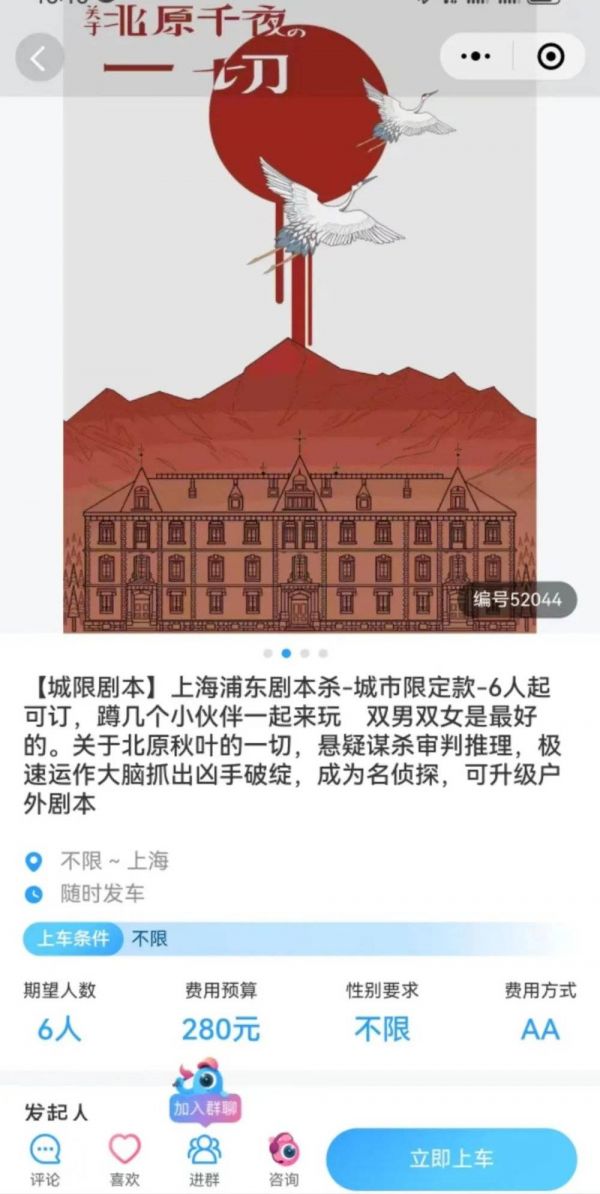 当然,墨鱼旅行也有尝试一些较为另类的产品。例如其在上海有一个6人的剧本杀团,本子名为“关于北原秋叶的一切”,售价280元/人。介绍中并没有提到其它服务,只是说可以升级为户外剧本杀,是否额外加钱也没有标注。
