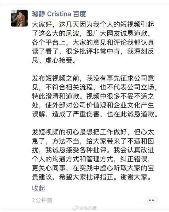 #百度副总裁深夜致歉# 百度璩静深夜致歉:初心是想把工作做好,但心太急了。对百度造成严重伤害,视频不代表公司立场,诚恳接受批评。