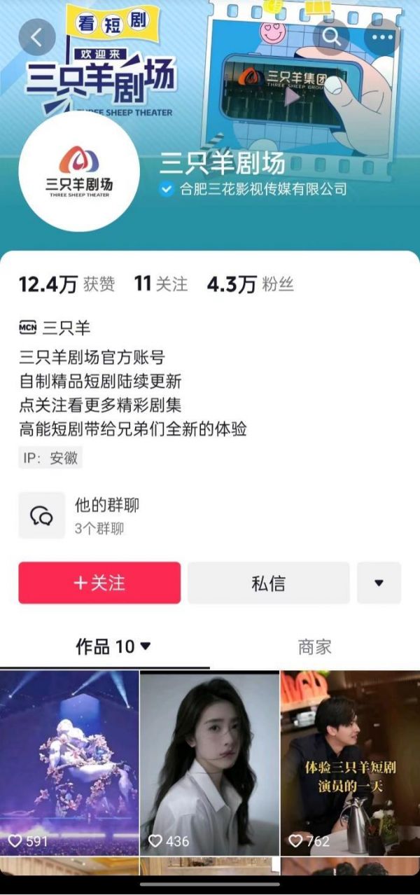 据了解,该剧改编自番茄小说同名作品,是一部现代甜宠类型小说,演员阵容包括三只羊网络旗下的多位达人。“三只羊剧场”在主页简介中还写道,“自制精品短剧陆续更新”。截至发稿,账号粉丝达4.3万。