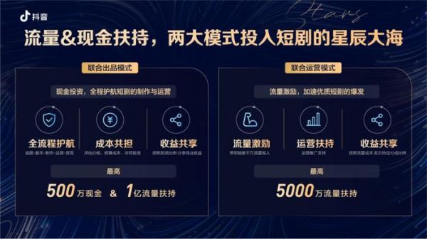 2021年以来,抖音、快手陆续面向MCN更新短剧扶持计划,吸引MCN入局短剧赛道。以抖音为例,其在2021年曾发布“短剧新番计划”,并与番茄小说等平台共同开发网文IP的短剧改编。2024年,抖音发布“辰星计划”,并推出联合出品、联合运营两大合作模式扶持创作者。