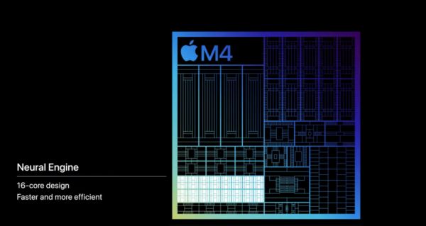 首发的M4芯片,是苹果在人工智能硬件方面的实力展现。它被苹果定义为“一个强大的人工智能引擎”,在CPU(中央处理器)、GPU(图形处理器)和NPU(神经网络处理单元)方面均做出新的改良。
