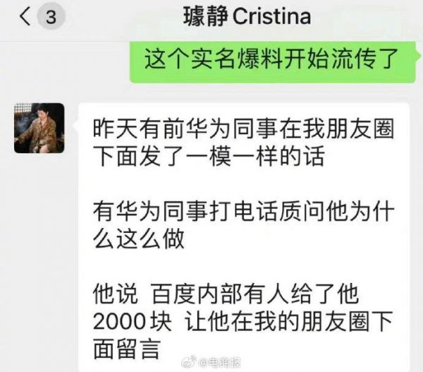 百度副总道歉后这事还没完,其任职华为期间的下属爆猛料,璩静回应:有人给了2千块让他留言。
