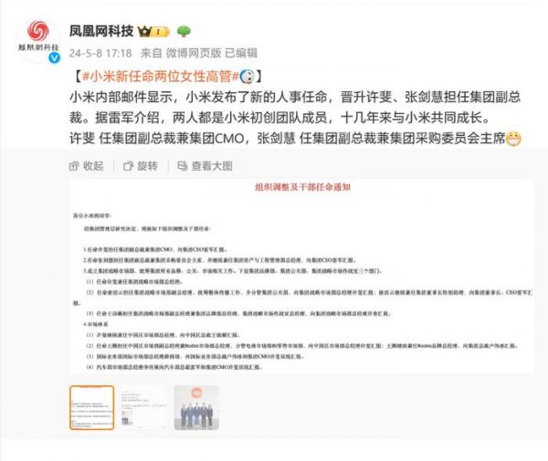 张剑慧当前的微博认证则是小米集团行政部总经理。雷军表示,两人均为小米创业之初就加入的员工,十余年来与小米共同成长,并在多个岗位上作出了重要贡献。值得一提的是,这是小米首次同时任命两位女性高管。
