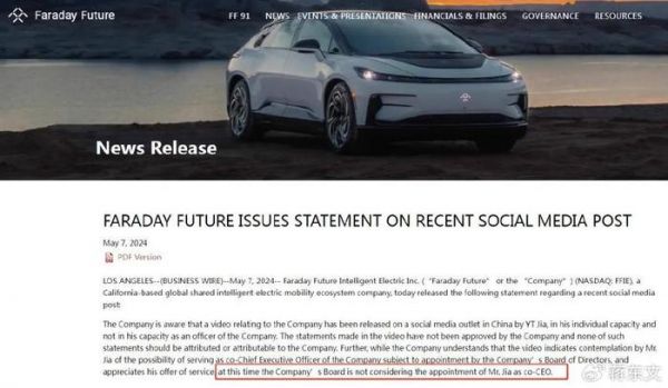 可惜,法拉第未来却并未领情,马上发布声明称,贾跃亭这是个人行为,公司并不认可,目前公司董事会不考虑任命其为联席CEO。
