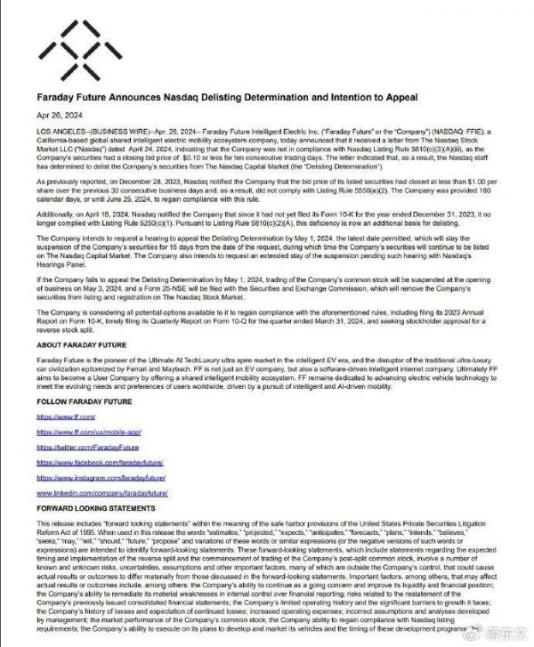 首先贾跃亭确认了FF(法拉第未来)的退市传闻,表示“已收到纳斯达克的退市意见函,FF确有退市风险,公司也已提交了通过整改合规维持上市资格的申诉。”