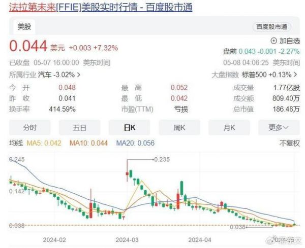 截至美东时间5月7日收盘,FF报价0.044美元,总市值186.48万美元,与2021年7月22日上市的市值45.11亿美元相比,FF的市值缩水了99.9%。