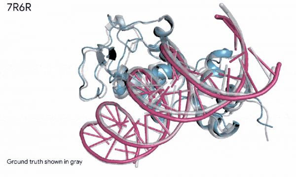 7R6R - DNA 结合蛋白:AlphaFold 3 对分子复合物的预测,其特征是蛋白质(蓝色)与 DNA 双螺旋(粉色)结合,与通过艰苦实验发现的真实分子结构(灰色)近乎完美匹配。